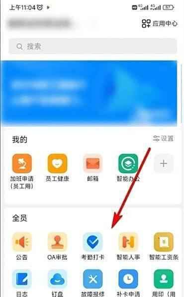 打開手機中的“釘釘”軟件,在頁面底部點擊中間的“工作臺”圖標,切換至工作臺界面。隨后,在“全員”選項下找到并點擊“考勤打卡”功能,進入考勤管理頁面。