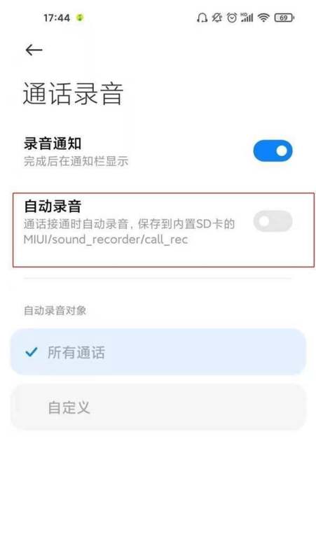 步驟三:關閉自動錄音開關將自動錄音右側的開關滑動至關閉狀態(灰色表示關閉)。