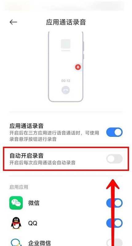重點操作:找到【自動開啟錄音】選項,將其右側的開關滑動至關閉狀態(灰色表示關閉)。