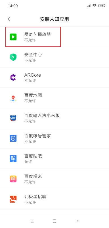 5.在“安裝未知應(yīng)用程序”頁面列表中,選擇要設(shè)置的應(yīng)用程序;