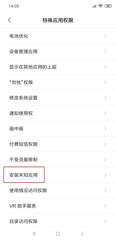 4.在“特殊應(yīng)用權(quán)限”頁面,點(diǎn)擊“安裝未知應(yīng)用”選項(xiàng);