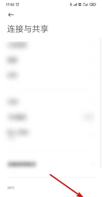 開啟NFC開關(guān):在“連接與共享”頁面中,找到NFC選項(通常顯示為“NFC”或“NFC功能”),點擊右側(cè)的開關(guān)按鈕。