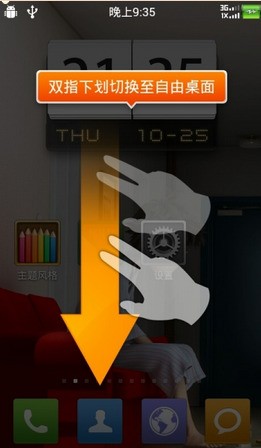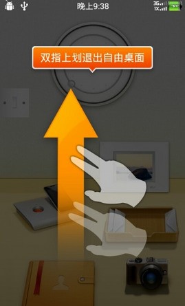 2、返回系統桌面,雙指從通知欄下拉,即可切換至自由桌面;雙指從屏幕下方上劃即可退出自由桌面。