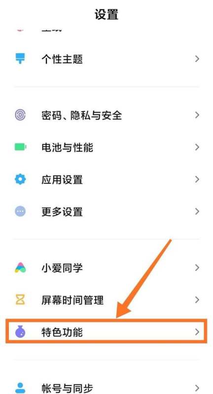 進(jìn)入特色功能界面:在“設(shè)置”界面中向上滑動(dòng),拖動(dòng)至頁面下方,找到并點(diǎn)擊“特色功能”按鈕。