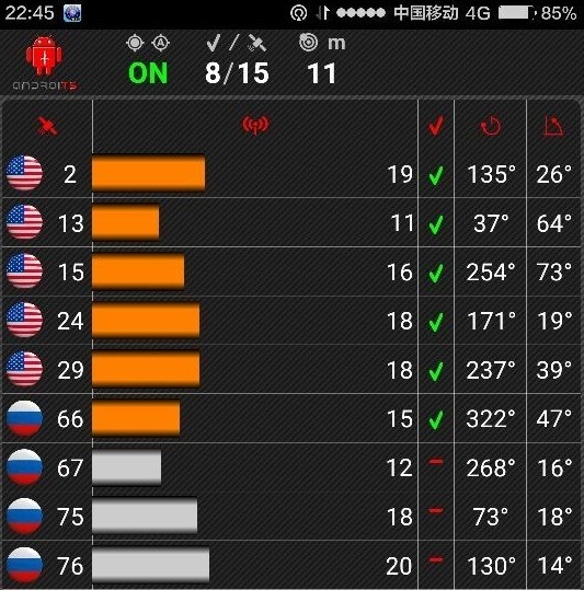 2、盡量在室外或者室內的窗戶旁邊,打開這個APP,讓軟件進行搜星,定位測試,一般5秒左右就能得出測試畫面,如下圖。