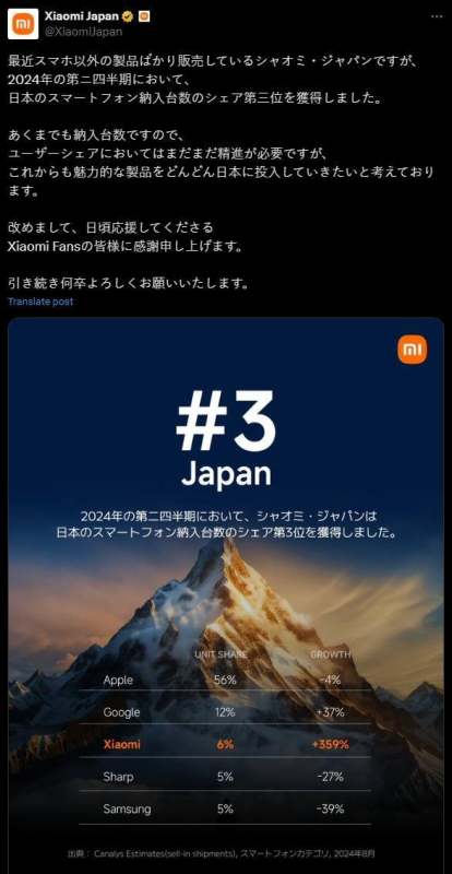 市場表現與突破根據小米日本官方賬號公布的數據,2024年第二季度小米手機在日本市場出貨量同比暴漲359%,首次進入市場前三名。這一成績標志著小米在日本市場實現了顯著突破,尤其在競爭激烈的環境中展現出強勁增長勢頭。