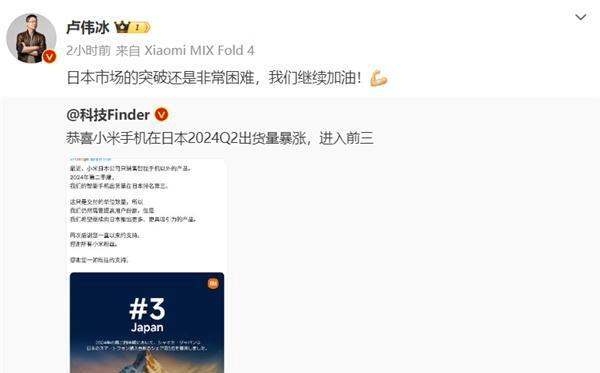 2024年第二季度小米手機在日本市場出貨量同比增長359%,成功躋身市場前三,盧偉冰回應稱將繼續努力提升市場份額。