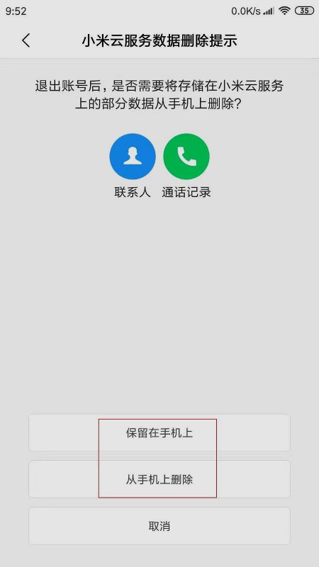 3、這時會彈出“小米云服務數(shù)據(jù)刪除提示”,可以根據(jù)需要選擇“保留在手機上”或“從手機上刪除”。