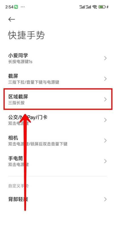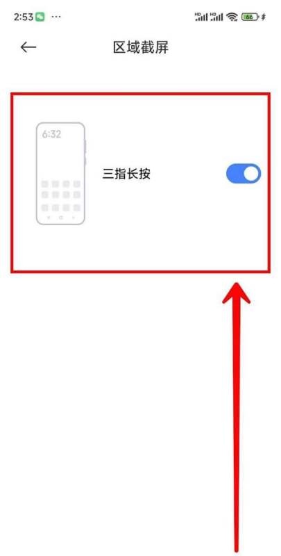 開啟區(qū)域截屏功能:在快捷手勢頁面中,點擊【區(qū)域截屏】選項,進入功能設置界面后,打開【三指長按】右側的開關按鈕。