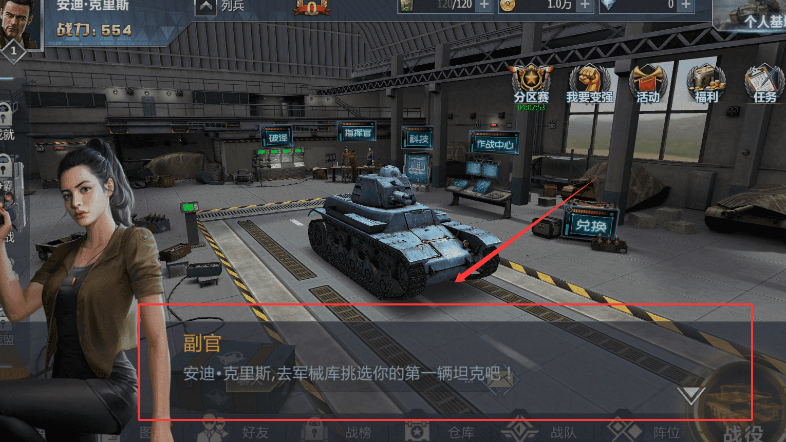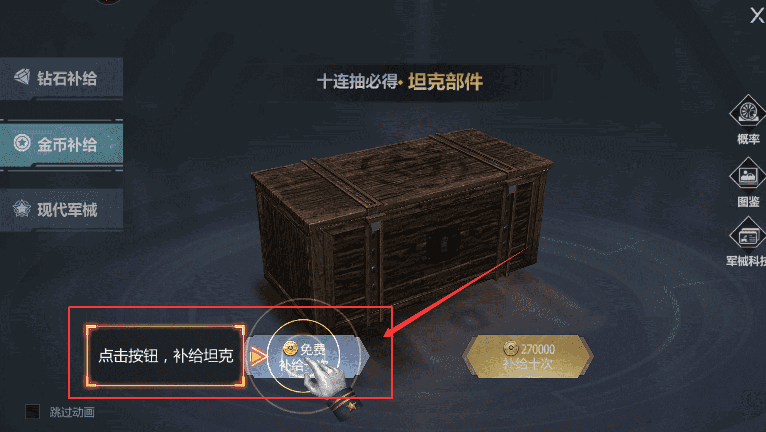 2、提升戰力的關鍵是獲取和強化軍械。點擊“金幣補給”或“鉆石補給”可以抽取坦克等裝備部件。