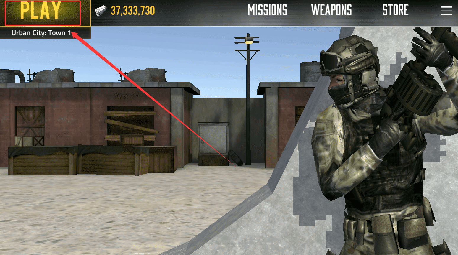 1、進入游戲后首先會看到主界面,上面有 PLAY、MISSIONS、WEAPONS、STORE 等選項。