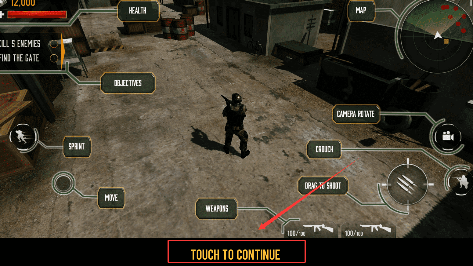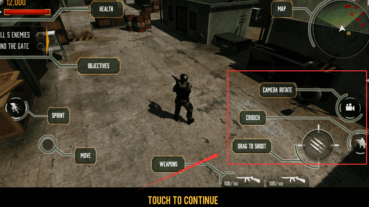 3、戰斗時注意屏幕上的“DRAG TO SHOOT”或“TAP TO SHOOT”區域,拖動或點擊這里就能開火。