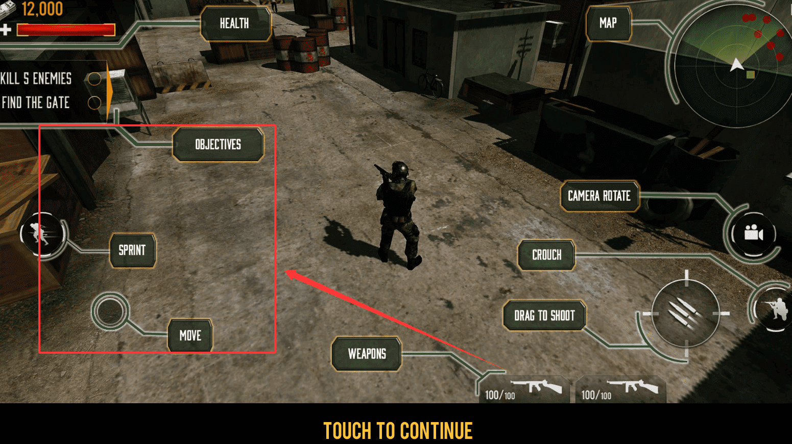 4、時刻留意左上角的“HEALTH”血量和“OBJECTIVES”任務目標,比如“KILL 5 ENEMIES”和“FIND THE GATE”。