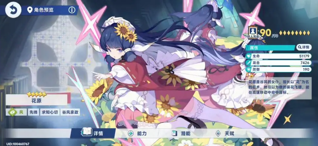 角色定位:風隊過渡副 C,僅用于開荒期缺輸出時,輸出約為花原的 60%,后期必棄